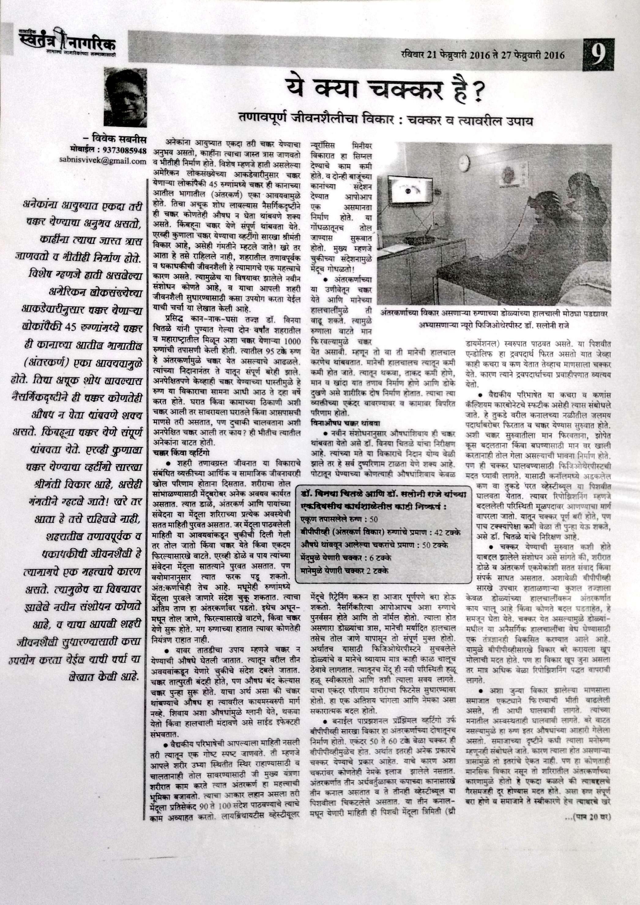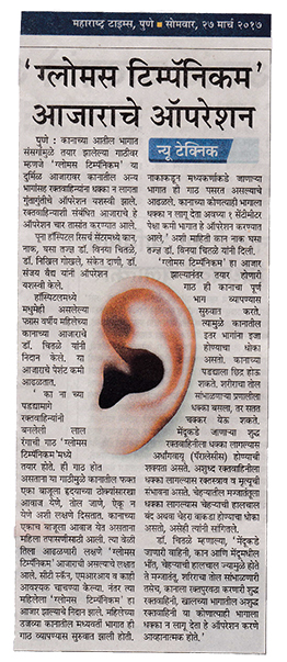 News article published in Maharashtra times on 17 th march 2017 regarding excision of Glomus tympanicum tumor done at Poona Hospital and Research Centre by Dr Chitale and her team.