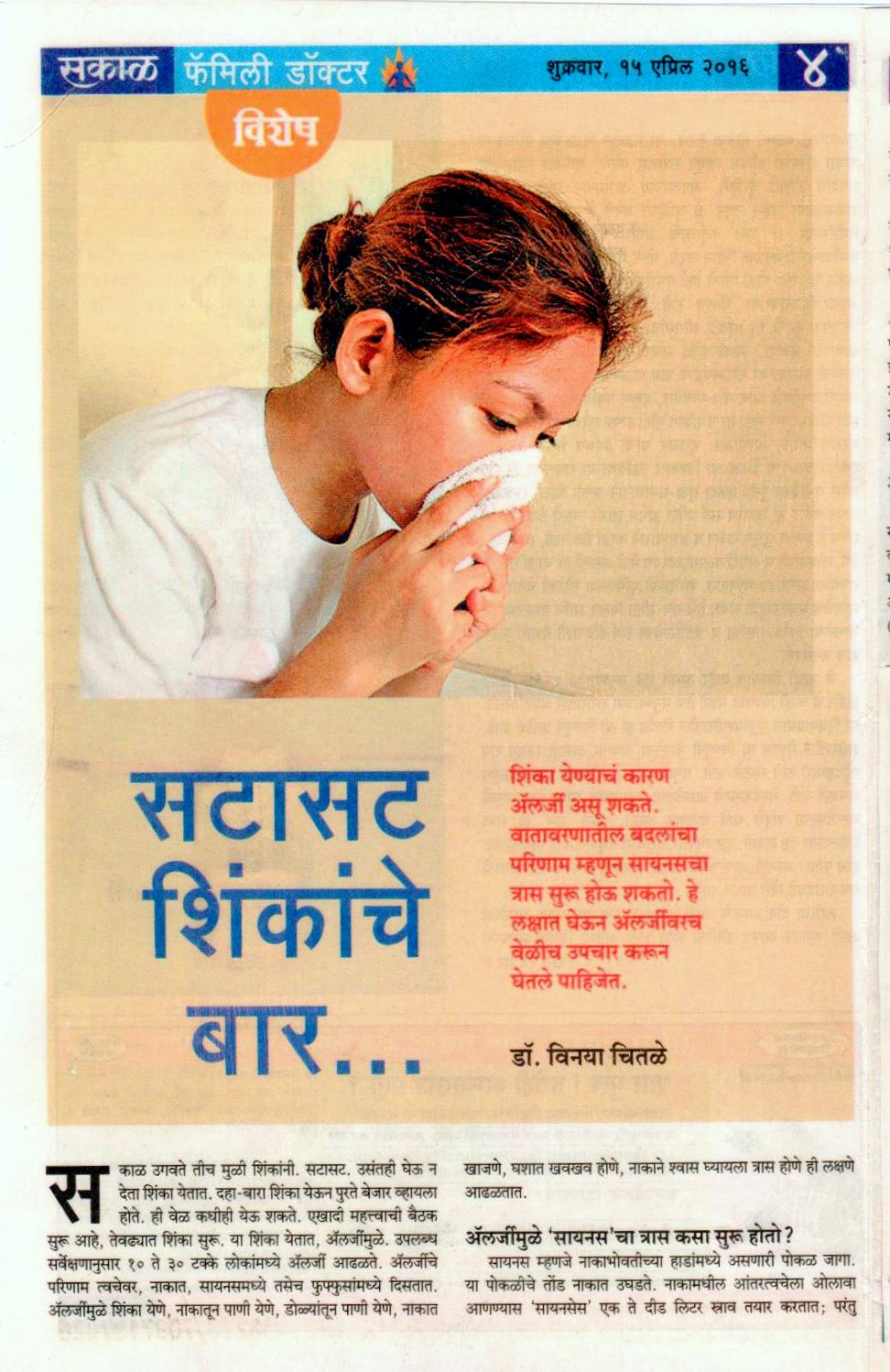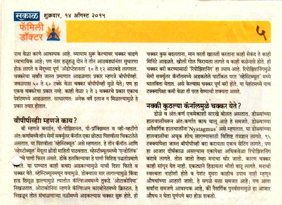 News article published in Family Doctor supplement of Sakal on 31 st March 2017 regarding awareness of hearing loss in school going children.
