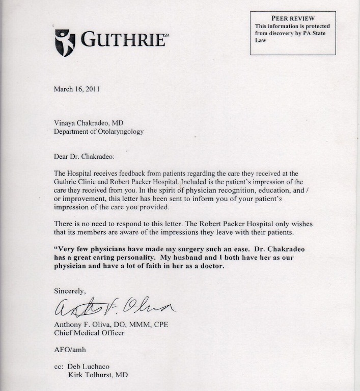 Dr Chakradeo is an excellent doctor. If you lose her you lose my husband and I. I can't say enough about what a wonderful doctor she is. - Anonymous patient - signed by Anthony F Oliva , DO, MMM, CPE,Chief medical officer, Robert Packer Hospital, Pennsylvania, 2011