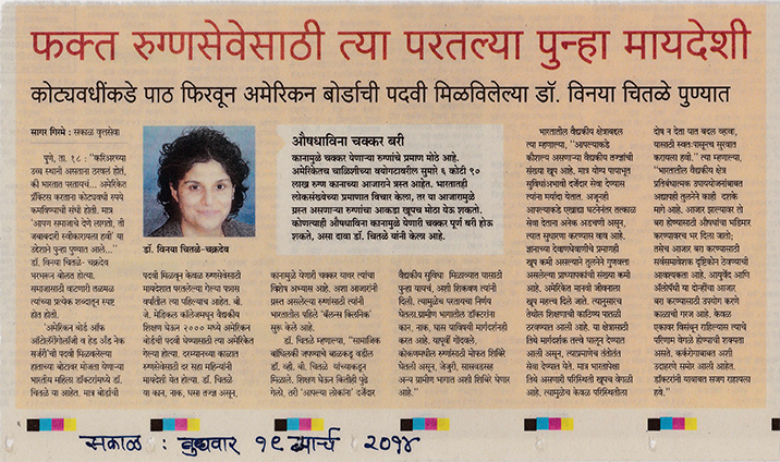 News article published in sakal on 18 March 2014 when Dr Chitale moved back to India