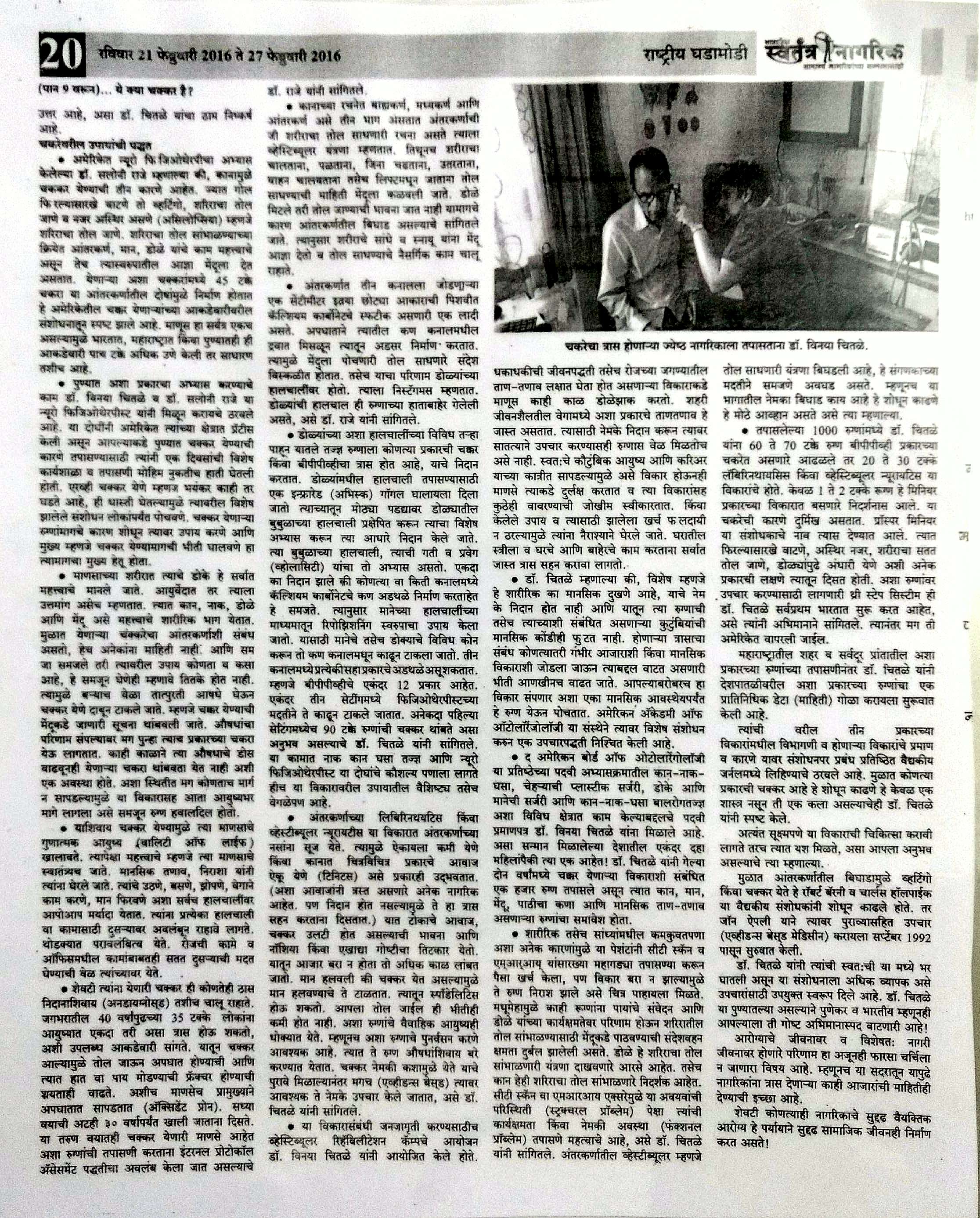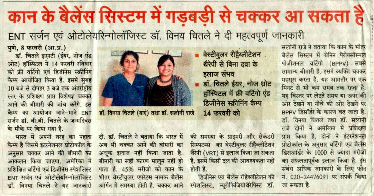 News article published in Maharashtra times on 17 th march 2017 regarding excision of Glomus tympanicum tumor done at Poona Hospital and Research Centre by Dr Chitale and her team.