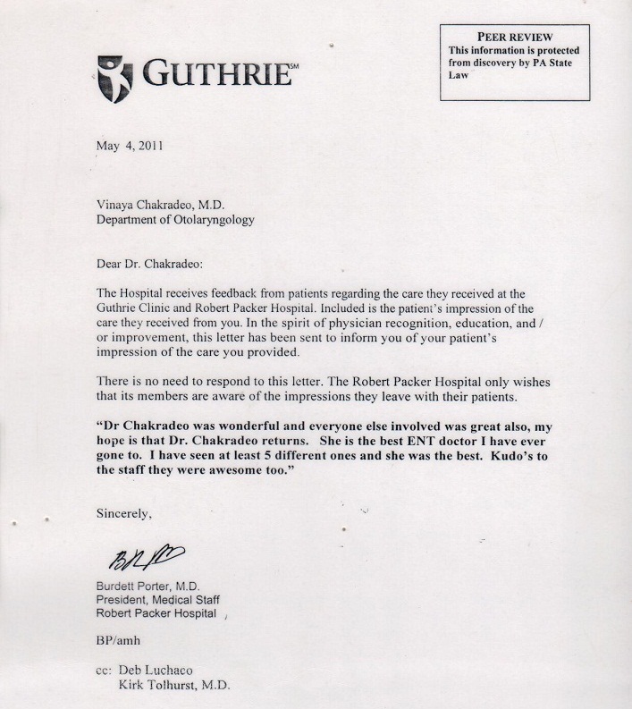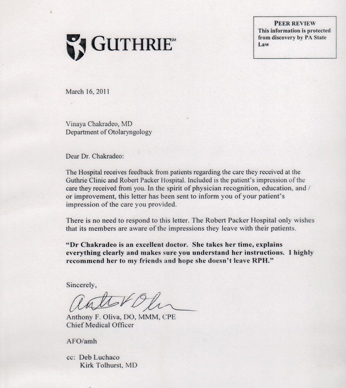 Dr Chakradeo is an excellent doctor. If you lose her you lose my husband and I. I can't say enough about what a wonderful doctor she is. - Anonymous patient - signed by Anthony F Oliva , DO, MMM, CPE,Chief medical officer, Robert Packer Hospital, Pennsylvania, 2011